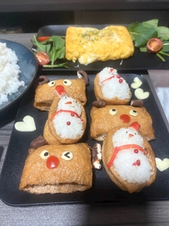 ななちゃんと一緒にクリスマスパーティーした写真 トナカイのおいなりさん♡ ゆきだるまのカプレーゼ❄️ ケーキまで作ってくれて天才すぎてた^_^💞